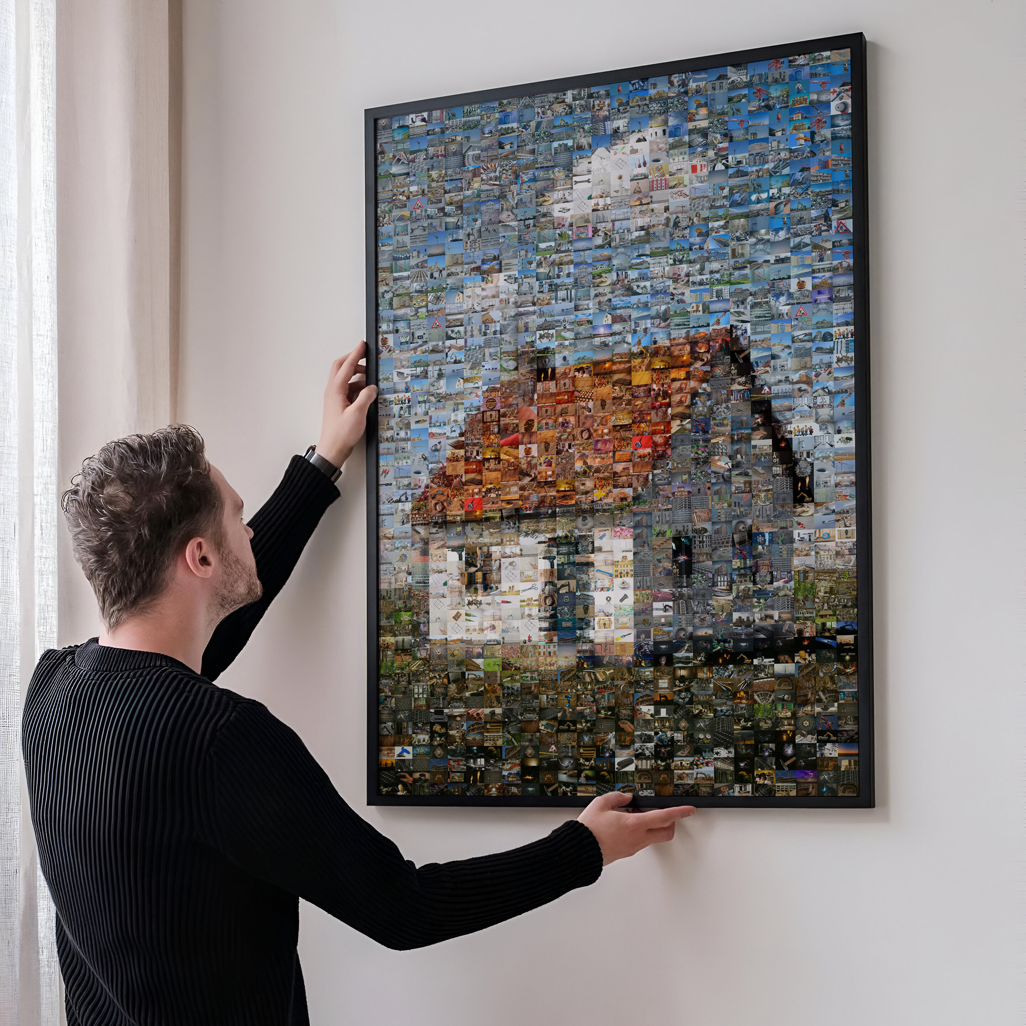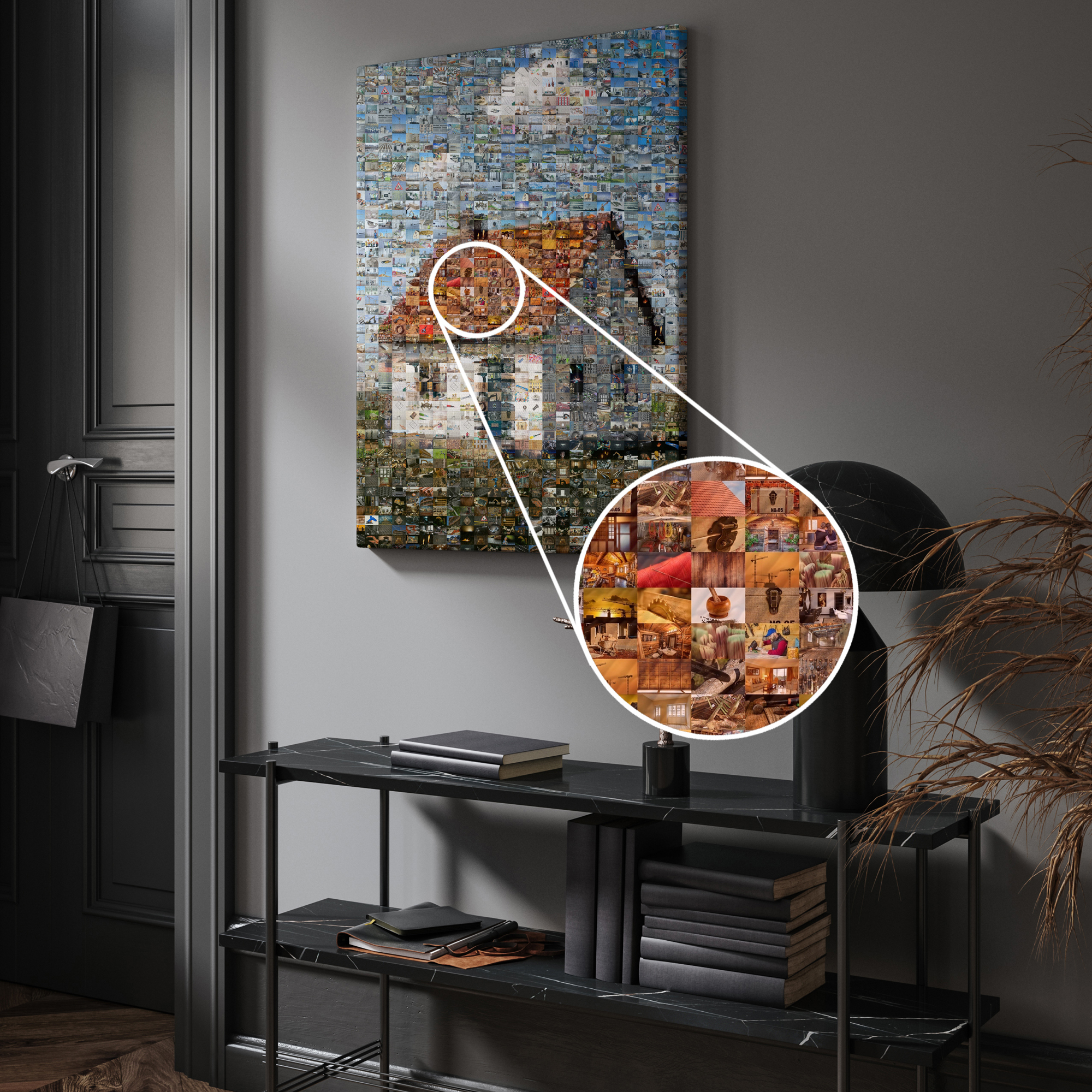Create yours now. Your project as a mosaic: a house motif built from all the site photos you captured during the build, from ground-breaking to move-in day. Progress shots, milestones, and proud moments merge into one artwork that documents the journey and keeps the story of your home alive with quiet pride.
